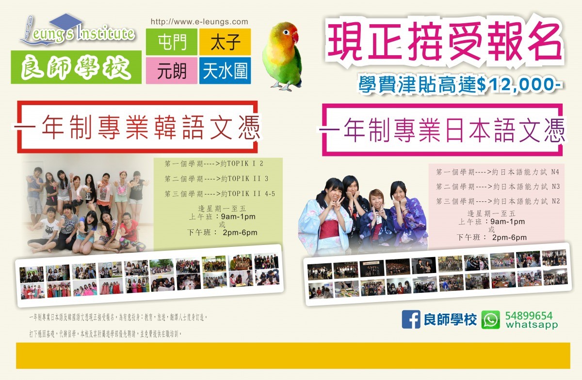 Since its establishment 15 years ago, Leung's Institute has been devoted to offering Japanese / Korean / French / Western / German courses and has made it easy for students to experience the cultures and languages of different countries through interactive teaching modes and regular free cultural activities. Each team of professional teachers is composed of experienced local and foreign teachers. Students are given free classes on a regular basis to review the quality of teaching and teaching effectiveness so that each student can easily learn foreign languages and acquire internationally recognized professional language certificates.