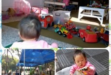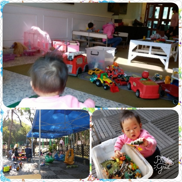 There is a large indoor, air-conditioned room & a grassed, outdoor area full of play equipment and toys.